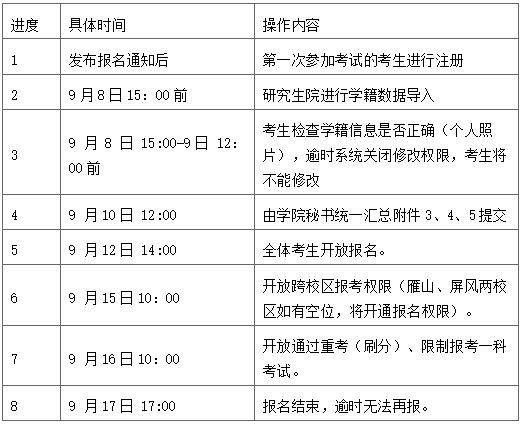 (四)报名前,务必检查照片是否为本人照片,学籍信息和考试校区是否准确。报名系统内没有照片或无学籍匹配信息的同学请将本人电子版照片(照片格式请看附件2)或学籍信息(附件3、4)提交到本学院教学秘书处,由学院收集好在9月10日12:00前统一提交研究生院培养学位科,逾期不再受理。